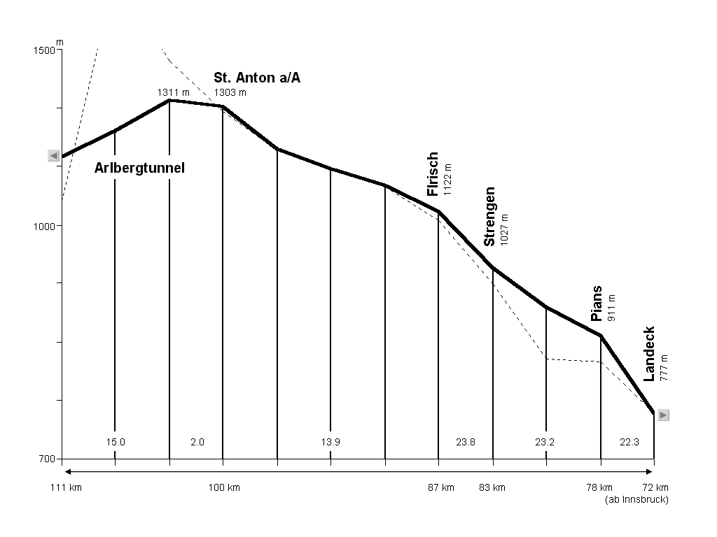 Von St. Anton a/A bis Langen a/A verläuft die Bahn im Arlbergtunnel (Denkschrift aus Anlass des zehnjährigen Betriebes: 2). Der höchste Punkt, der sogenannte Scheitelpunkt, befindet sich im Km 104,241 und liegt 1310,926 m über dem Meeresspiegel (Wegenstein: 8).