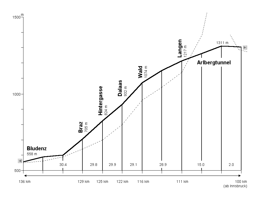 Die Arlbergbahn umfasst den Streckenabschnitt Innsbruck-Bludenz mit einer Länge von 136,286 km (Wegenstein: 10) und ist durch eine enge Anpassung der Linienführung an die Formen des Reliefs gekennzeichnet. Die Unregelmäßigkeiten des Reliefs und die daraus resultierende erhöhte Kurvenhäufigkeit werden jedoch nicht ungern in Kauf genommen, weil dadurch die Aufstiegsrampe verlängert und somit annehmbare Steigungsverhältnisse erzielt werden können. Dennoch sind die beiden Zufahrtsrampen streckenweise außerordentlich steil. Während die maximale Neigung auf der Ostrampe 26,4 ‰ nicht übersteigt, beträgt diese auf der Westrampe 31,4 ‰ (Tiefenthaler: 59). Durch diese besonderen Neigungsverhältnisse wird jedoch der Bahnbetrieb besonders erschwert. So beträgt für einen Güterzug mit einer Lokomotive der Baureihe 1044 oder der Baureihe 1016 die Regelbelastung für die Fahrtrichtung Bludenz-Langen nur 470 Tonnen (Laublättner, 11.12.2003).